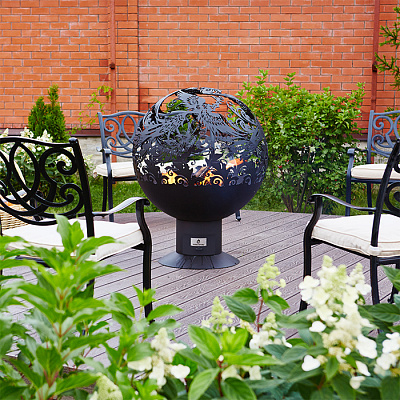 Уличный очаг Жар-птица Firecup представляет собой сферу из металла, на которой вырезана жар-птица руками профессионального мастера. Через многочисленные прорези просвечивает пламя, озаряя все вокруг. Несмотря на уникальный дизайн, кострище отлично вписывается в любую обстановку как во дворе, так и на природе.