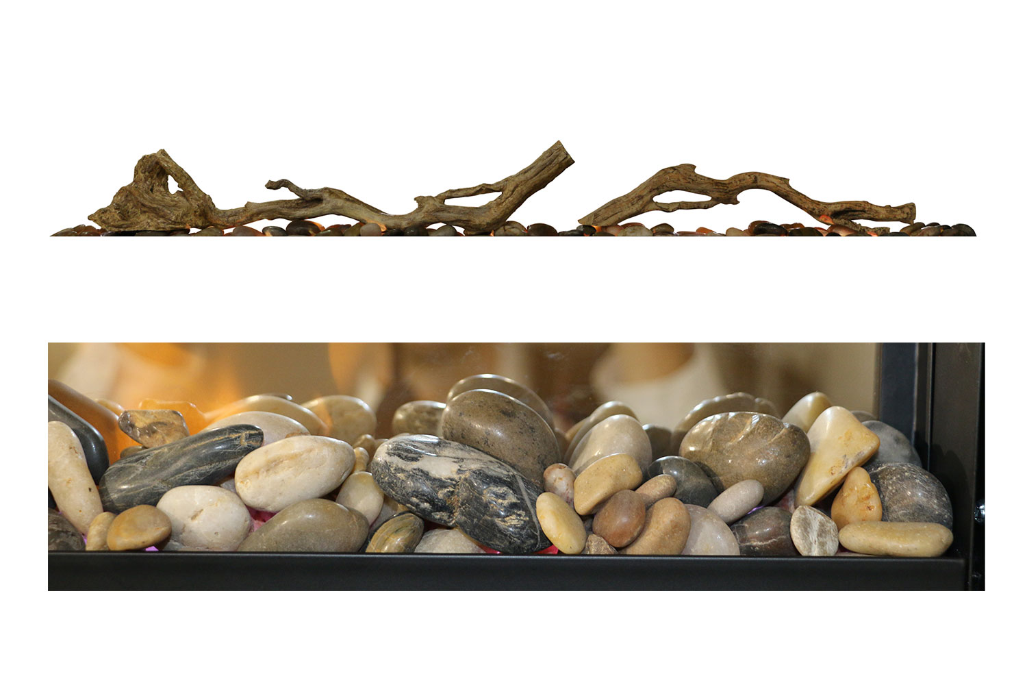 В базовой комплектации очаг Ignite XLF поставляется с прозрачными акриловыми кристаллами. При желании можно приобрести дополнительный комплект аксессуаров, состоящий из декоративной гальки и поленьев.