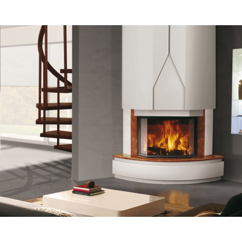 Угловой камин Palazzetti Montecarlo (угловая) выполнена из белого бучардированного камня, столешница из полированного мрамора Rosso Alhambra.