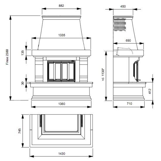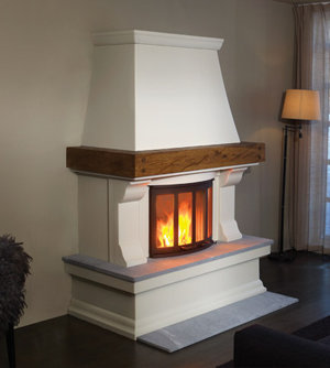 Модель относится к пристенным каминам деревенского дизайна, с характерными элементами этого стиля: Д-образной формой корпуса, каминной балке из массива дерева и высоким дымоходным колпаком.