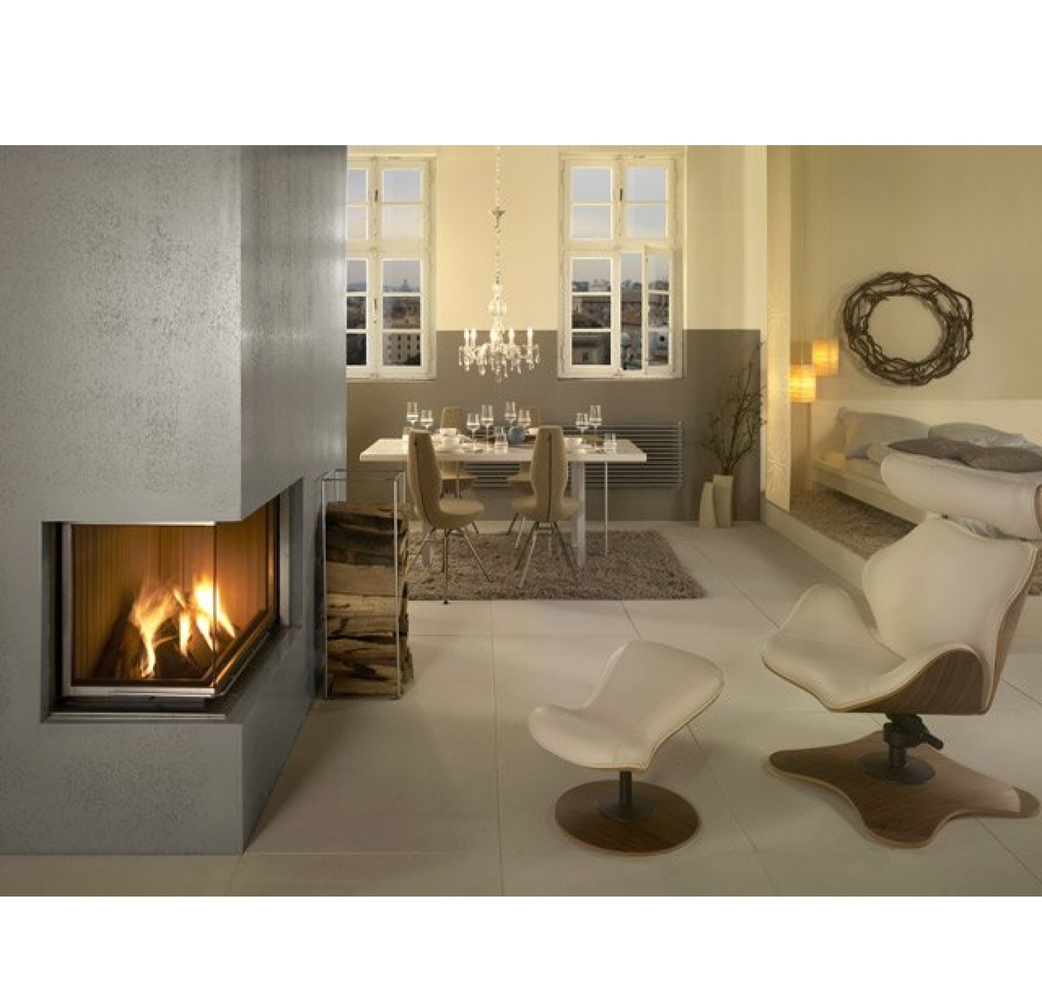 Угловая каминная топка с Г-образным стеклом. Боковое стекло слева. Топочная камера футерована шамотом. Подъёмный механизм двери (система Easy-Lift). Возможно подключение воздуха извне.