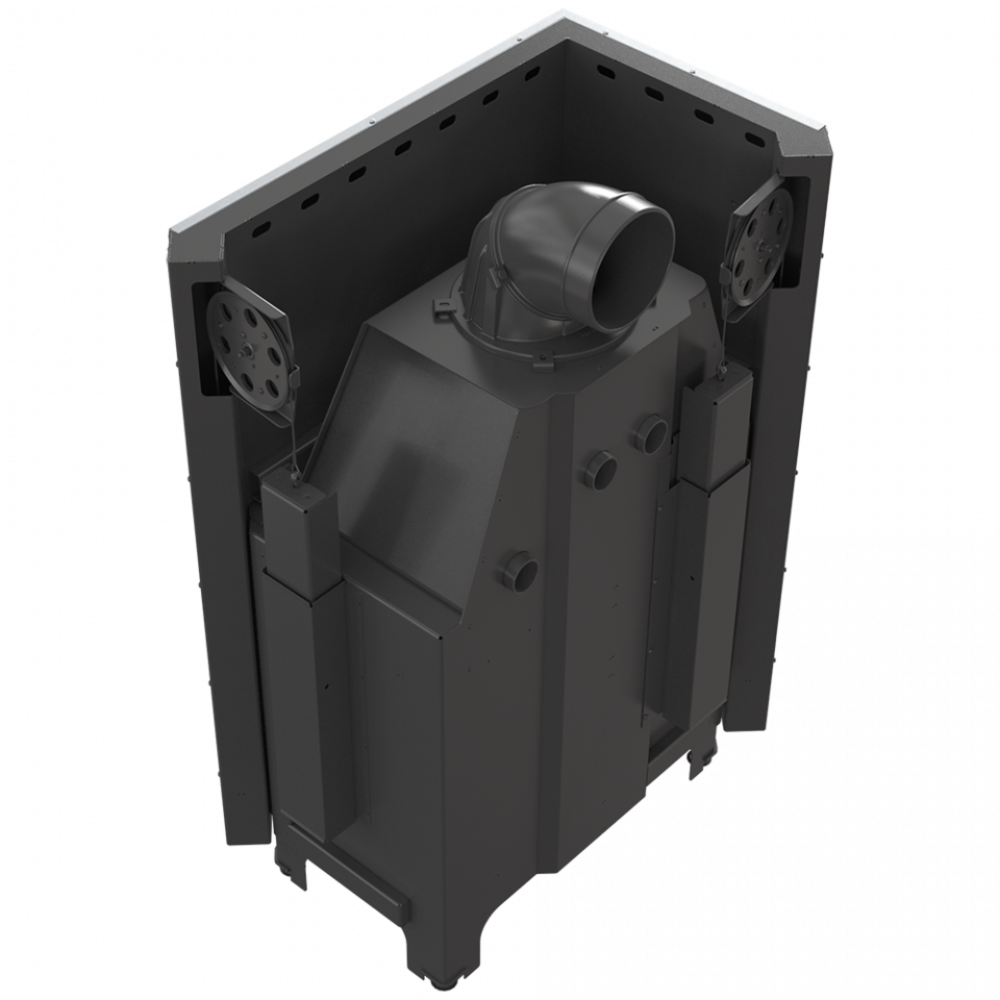 - Высокий переход из камина в дымоход и размещены поперек водяные дефлекторы увеличивают поверхность теплообмена между топкой и окружающей средой. Понижение температуры дымовых газов приводит к увеличению мощности устройства.